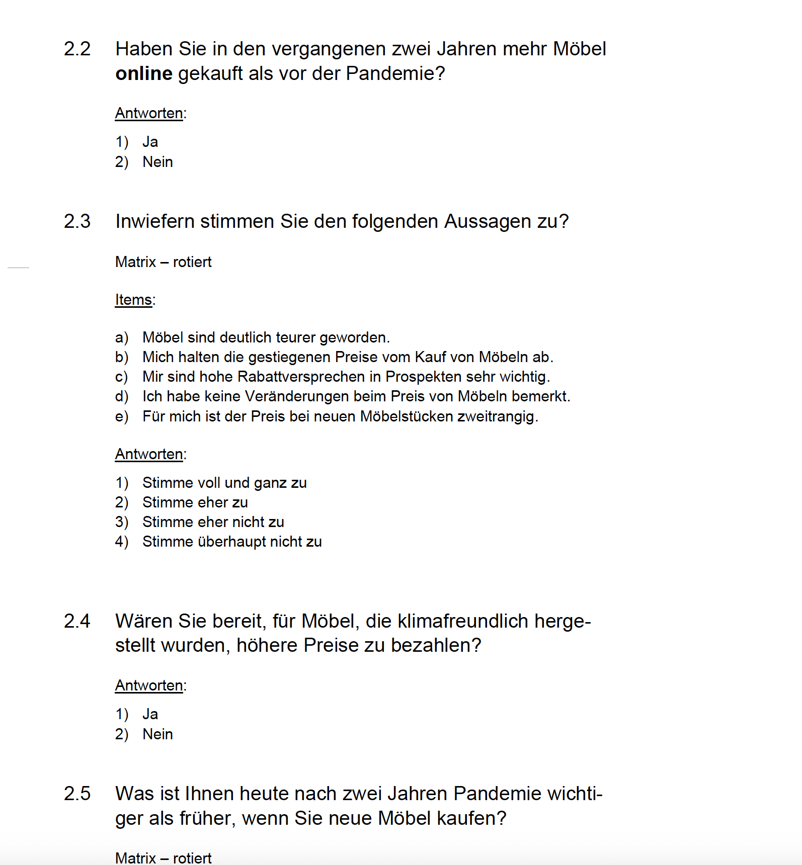 Wir haben zusammen einen Fragebogen entwickelt, der in diesen schwierigen Tagen wichtige Antworten liefern kann zur Stimmungslage und Anschaffungsneigung der Menschen, zu Fragen des Kaufverhaltens auf der Fläche und online, zu den Konsequenzen von langen Lieferzeiten oder auch zu der Frage, ob die Menschen bereit sind, mehr für ein Möbelstück auszugeben, wenn es klimafreundlich hergestellt wurde.