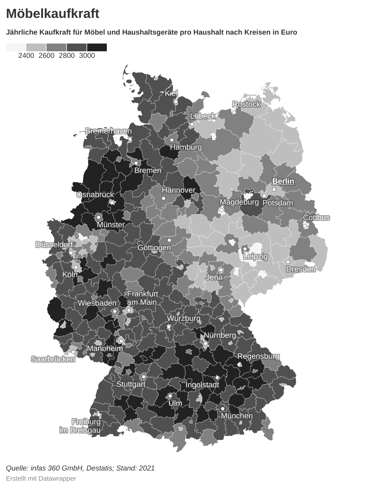 Wir kombinieren unsere Vielfalt an Daten mit Befragungsdaten. Das heißt: Wenn es zu einem bestimmten Thema keine amtlichen oder privat verfügbaren Daten gibt, dann befragen wir halt über 10.000 Personen online. Das ist unser USP. Unsere Befragten geben bei den Online-Umfragen freiwillig ihre Adresse an. Die Datenbank der Infas 360 beinhaltet wiederum rund 700 Merkmale zu allen circa 23 Mio adressierbaren Gebäuden sowie unzählige weitere Informationen auf höheren Ebenen. Diese Daten werden dann anonymisiert um die Befragungsdaten angereichert. Und dann können statistische Zwillinge gesucht werden. Also, wenn der oder die Befragte zum Beispiel angegeben hat, 1.000 Euro pro Jahr für Möbel auszugeben und an der Adresse herrscht eine bestimm- te Kombination unserer mikrogeographischen Merkmale vor, ist die Kaufkraft mit hoher Wahrscheinlichkeit an Adressen mit einer ähnlichen Merkmalskombination gleich hoch. Die Schätzwerte werden für alle circa 19 Mio Wohnadressen berechnet und auf be- liebige Ebenen aggregiert. So können unterschiedlichste regionale Potenzialkennziffern und Marktanteile berechnet werden.