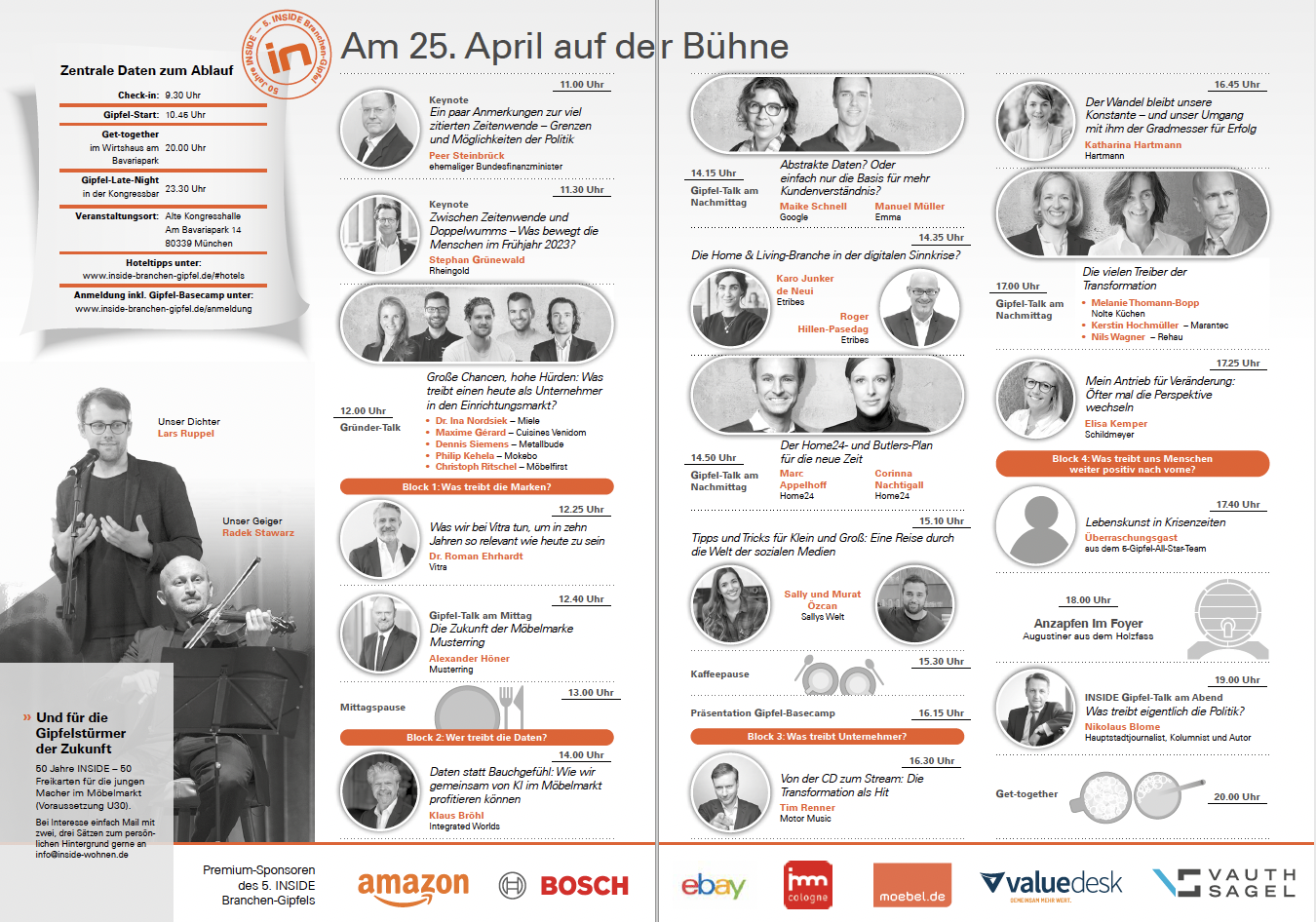 Ab 9.30 Uhr ist am Gipfel-Tag Check-in mit Frühstück, u.a. mit den besten Zimtschnecken der Stadt direkt aus dem Ofen der Zimtschneckenfabrik. Um 10.45 Uhr starten wir auf der Bühne. Peer Steinbrück wird um 11.00 Uhr mit seiner Keynote loslegen. Alle Details und die Titel der Impulse unserer Protagonisten und der zahlreichen Gipfel-Talks finden Sie im Gipfel-Programm direkt hier.